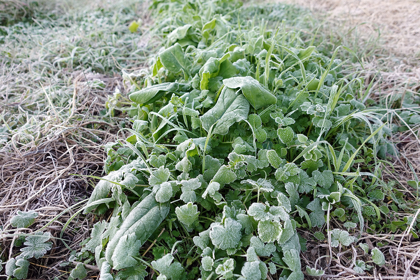 サニーレタス、ほうれん草はこのくらいの霜ではへこたれない。溶ければ大丈夫だ。