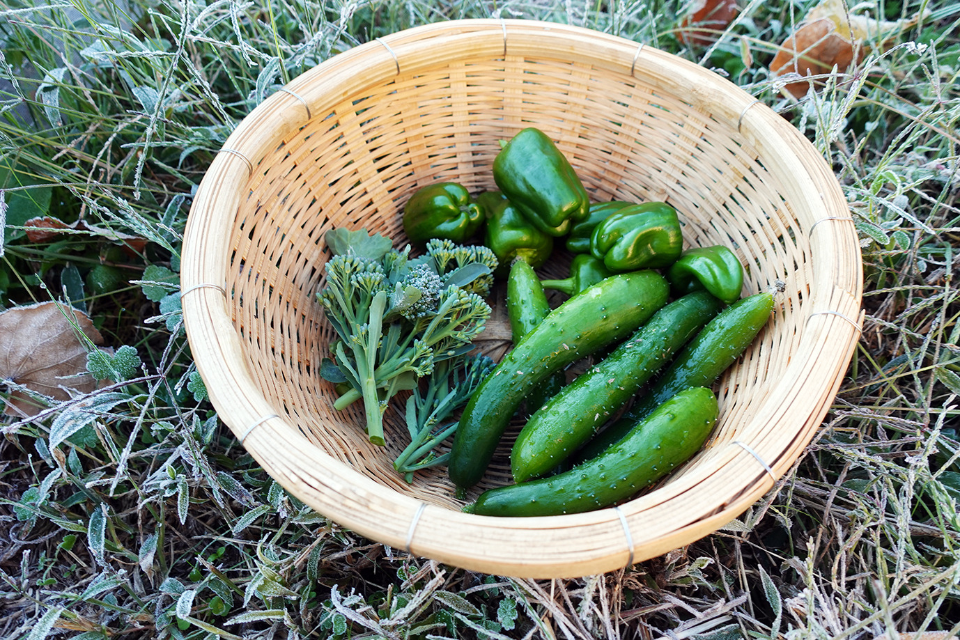 例年通り、10月の下旬の初霜が降りた。大根やニンジンは霜化粧だ。強い霜ではないが、頑張っていたきゅうり、ピーマンもこれで終わりだろう。最終の収穫をした。