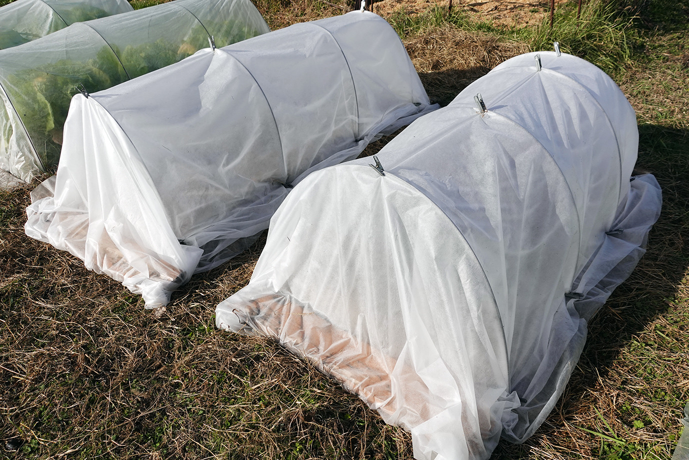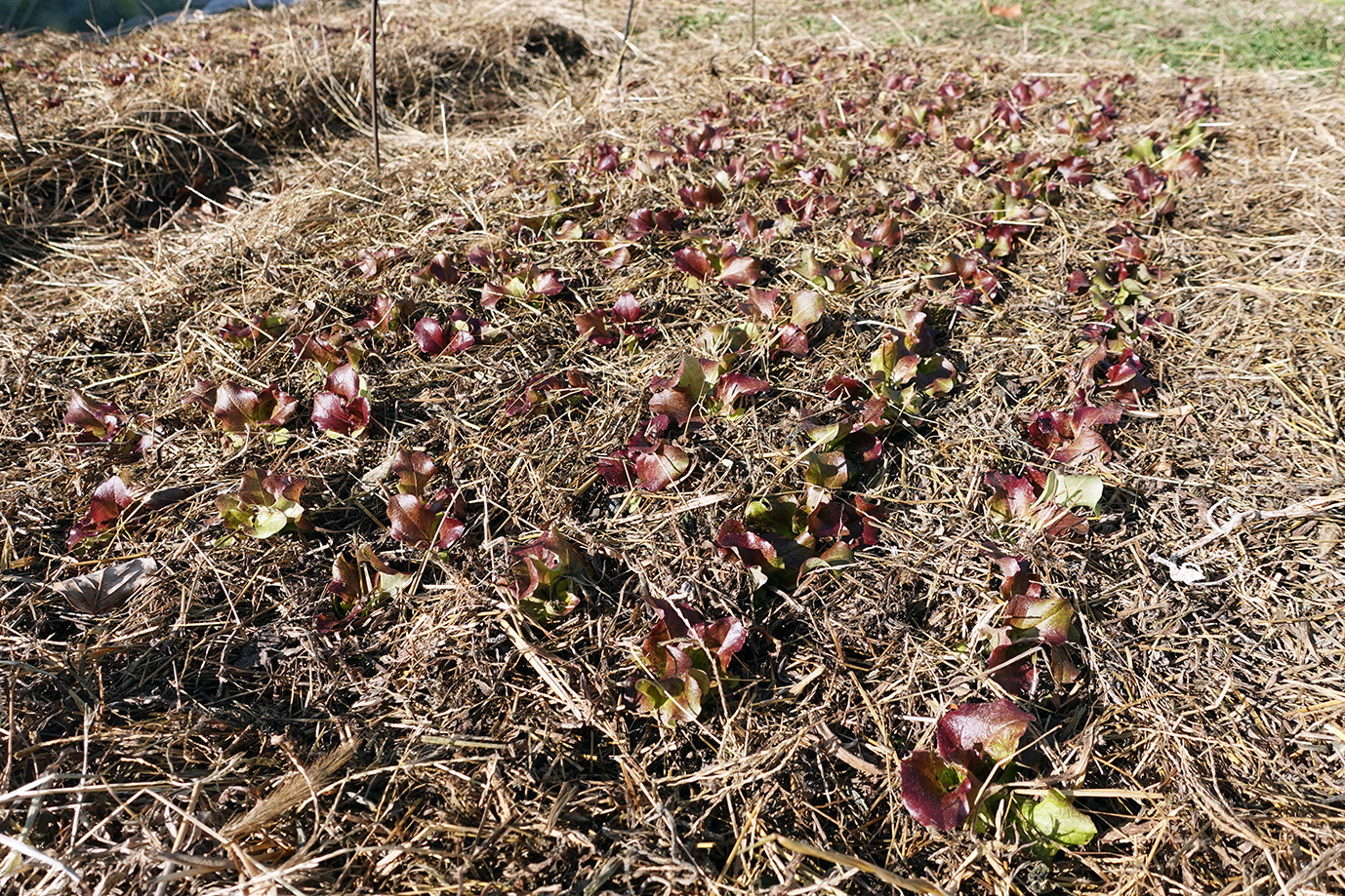 ようやく越冬サニーレタスの定植を行う。2本ずつの小さめの苗を定植し、寒さ対策の草マルチをする。最後に、二重の不織布で霜よけと同時に雨・雪をカット。苗が完全に凍りつかないようにする。